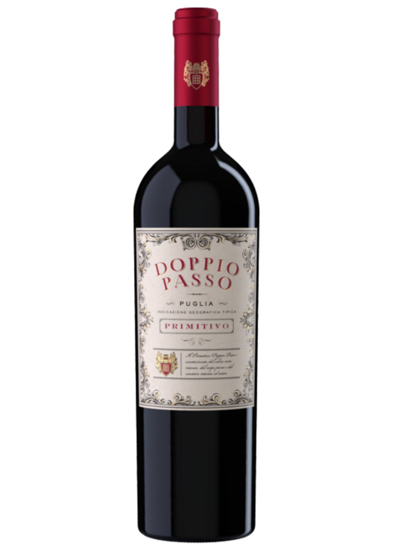 Đây là chai vang biểu tượng, là linh hồn của thương hiệu. Được làm từ 100% nho Primitivo từ bán đảo Salento, Puglia, áp dụng hoàn hảo phương pháp “Doppio Passo” (thu hoạch 2 giai đoạn). Rượu có màu đỏ ruby đậm sâu. Hương thơm nồng nàn, bùng nổ với các loại quả đen chín mọng như mận, anh đào đen, dâu đen, quyện với một chút hương gia vị ngọt ngào. Trong vòm miệng, rượu thể hiện sự tròn trịa, đậm đà (full-bodied) với cấu trúc tannin cực kỳ mềm mại, mượt như nhung, để lại hậu vị ngọt ngào của trái cây kéo dài. Kết hợp ẩm thực: Hoàn hảo với các món mỳ Ý sốt thịt, pizza, sườn nướng BBQ, thịt bò hầm và các loại phô mai trưởng thành. Chai vang khởi đầu hoàn hảo để hiểu về phong cách đặc trưng của Doppio Passo: đậm đà, mềm mại và vô cùng dễ uống.