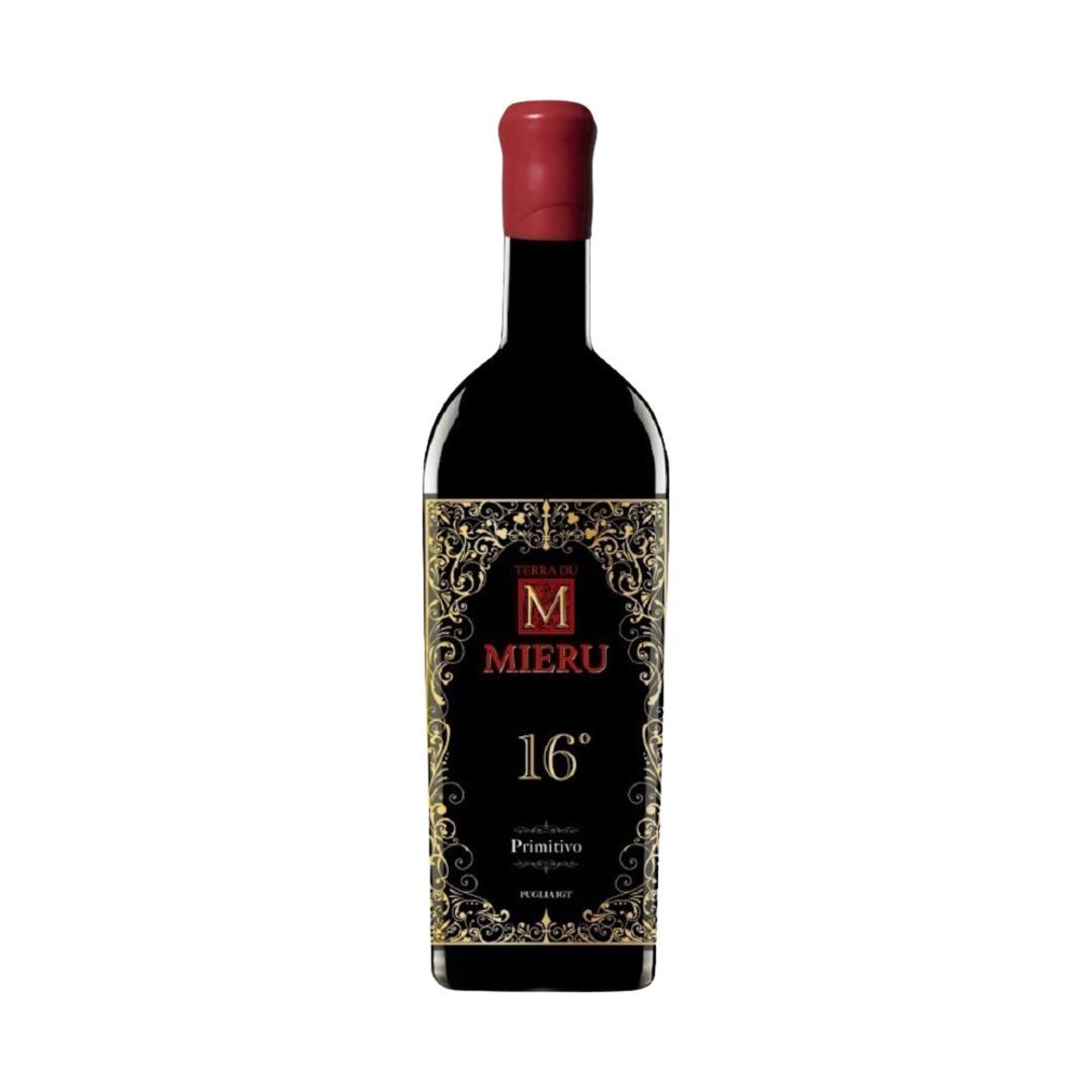 Rượu vang đỏ Terra du Mieru 16 Primitivo IGT có hương vị tuyệt vời của trái cây chín, mận chín, vị bánh nướng, sô cô la, da thuộc, kết thúc dài với mùi gỗ. Thích hợp với pho mát và heo muối